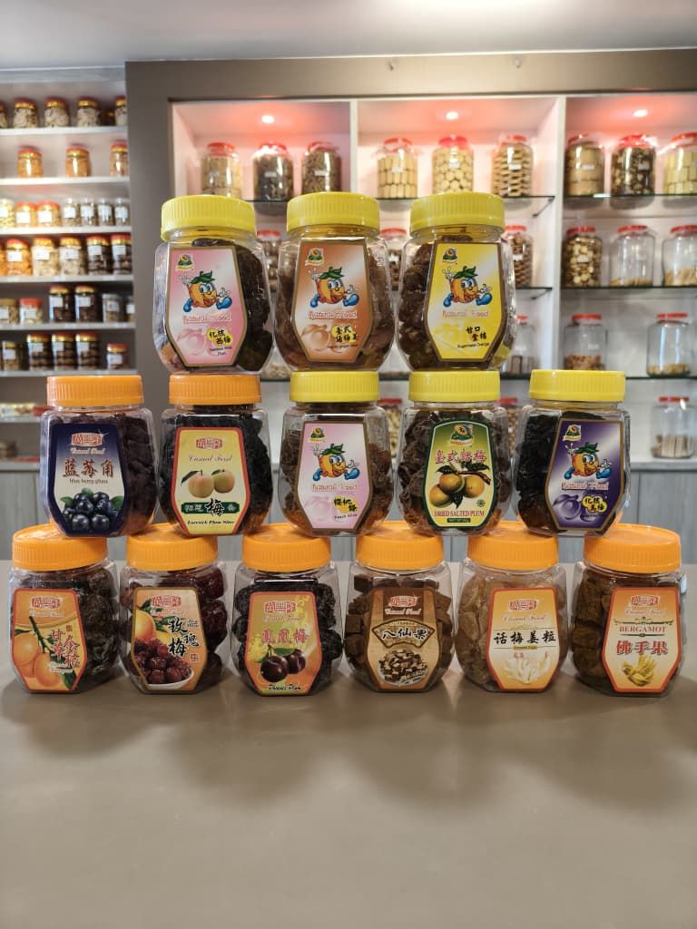 樱桃条 Peach Slice, 甘口金桔 Sugariness Orange, 化核乌梅 Kernel Free Plum, 壹式话梅姜 Honey Ginger Slice, 甘草金桔 Licorice Kumquat, 玫瑰梅 Rose Plum, 凤凰梅 Phoenix Plum, 话梅姜粒 Granulated Ginger, 化核西梅 Seedless West Plum, 壹式话梅 Dried Salted Plum, 蓝莓角 Blueberry Plum, 八仙果, 佛手果 Bergamot, 相思梅条 Loresick Plum Slice, 话梅姜宁 Ginger Flake